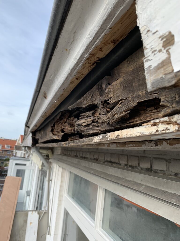 Het overstek liet hier een scheur zien waaruit wij opmaakten dat vocht het probleem was.
