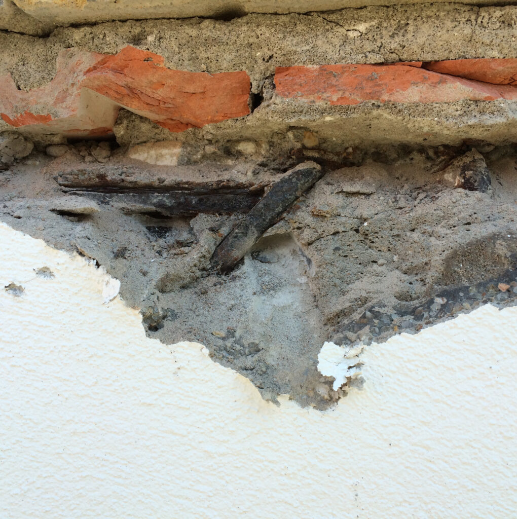 Oorzaak is de roestende wapening welke na het vrijhakken ervan roestwerend behandeld is geworden.