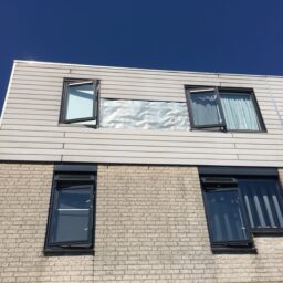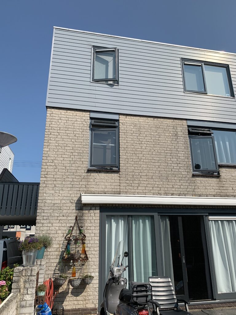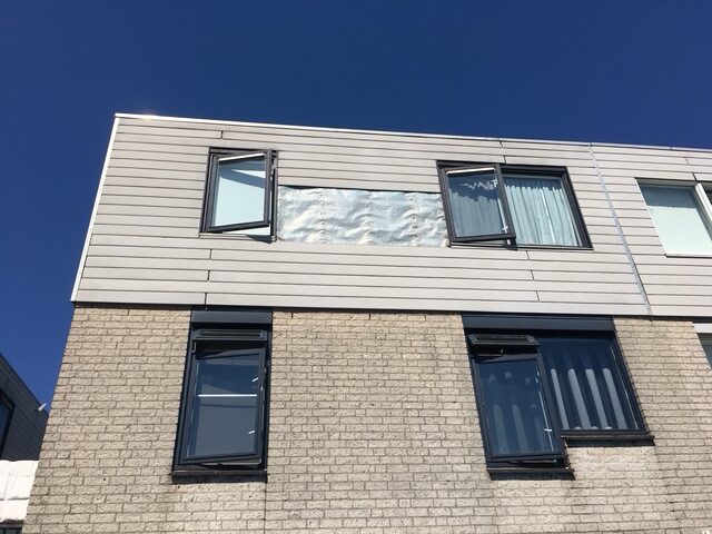 Bestaande gevelbetimmering was vergaan en daardoor lieten delen spontaan los met lekkages als gevolg.
