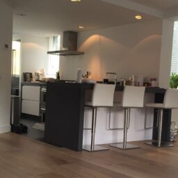 Het plafond is ten behoeve van de verlichting verlaagd en geeft de ruimte van keuken met bar aan.