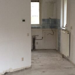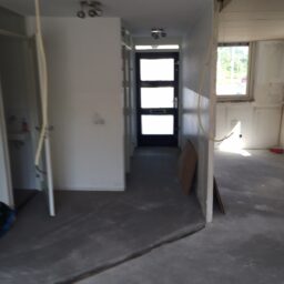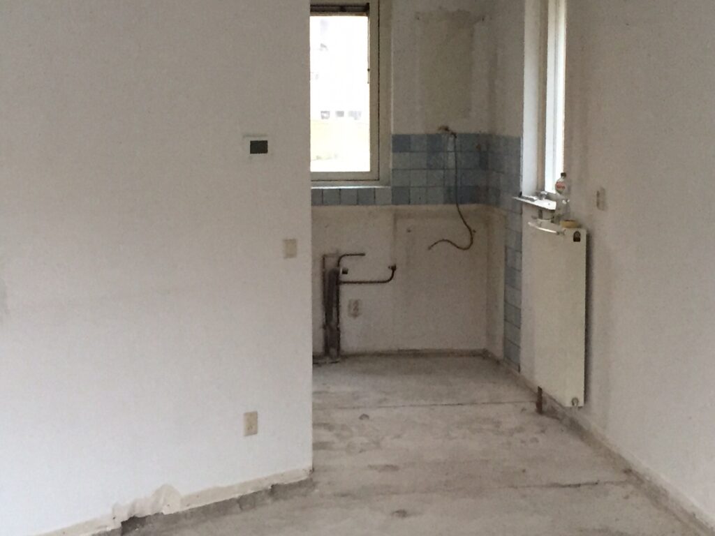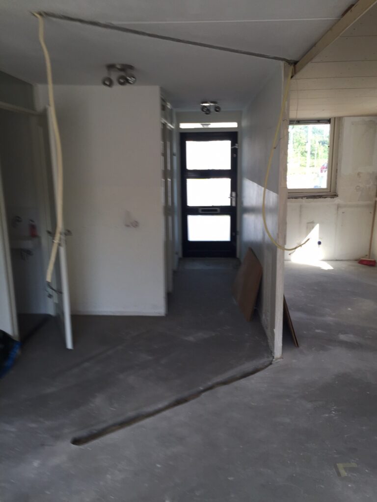 Het slopen van de keuken en bestaande dekvloer was nodig om de veranderingen uit te kunnen voeren.