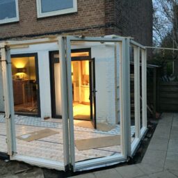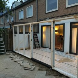 De oude serre is verwijderd en op de bestaande vloer zijn hardhouten kozijnen geplaatst welke later voorzien zijn van iso glas.
