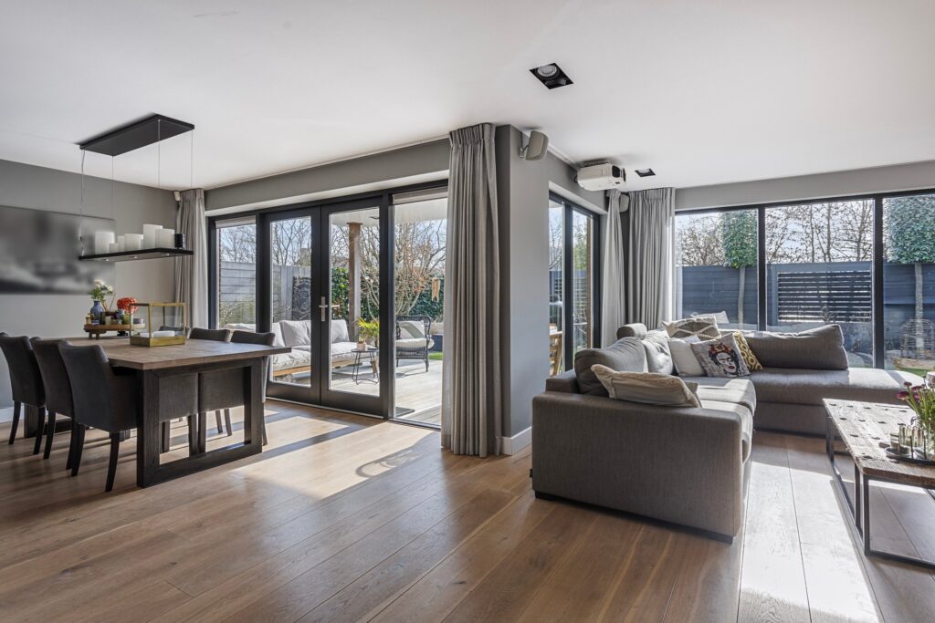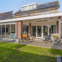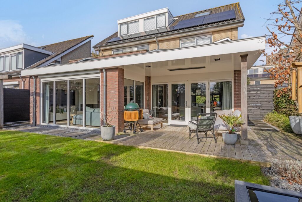 De veranda werd voorzien van een hard houten kozijn met twee openslaande deuren terwijl het dak aaneengesloten doorloopt.