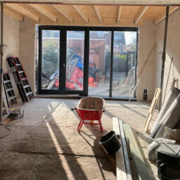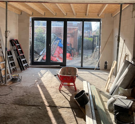 Een betonnen vloer maakt het mogelijk muren te plaatsen met een nieuw kozijn en dakconstructie.